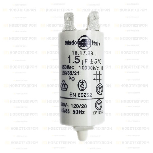 Кондензаторът е с капацитет 1.5 µF ±5% и номинално работно напрежение 450V AC, което го прави подходящ за непрекъснат режим на работа. Използва се за фазово изместване между намотките, осигурявайки стабилна, тиха и ефективна работа на електродвигателя.
